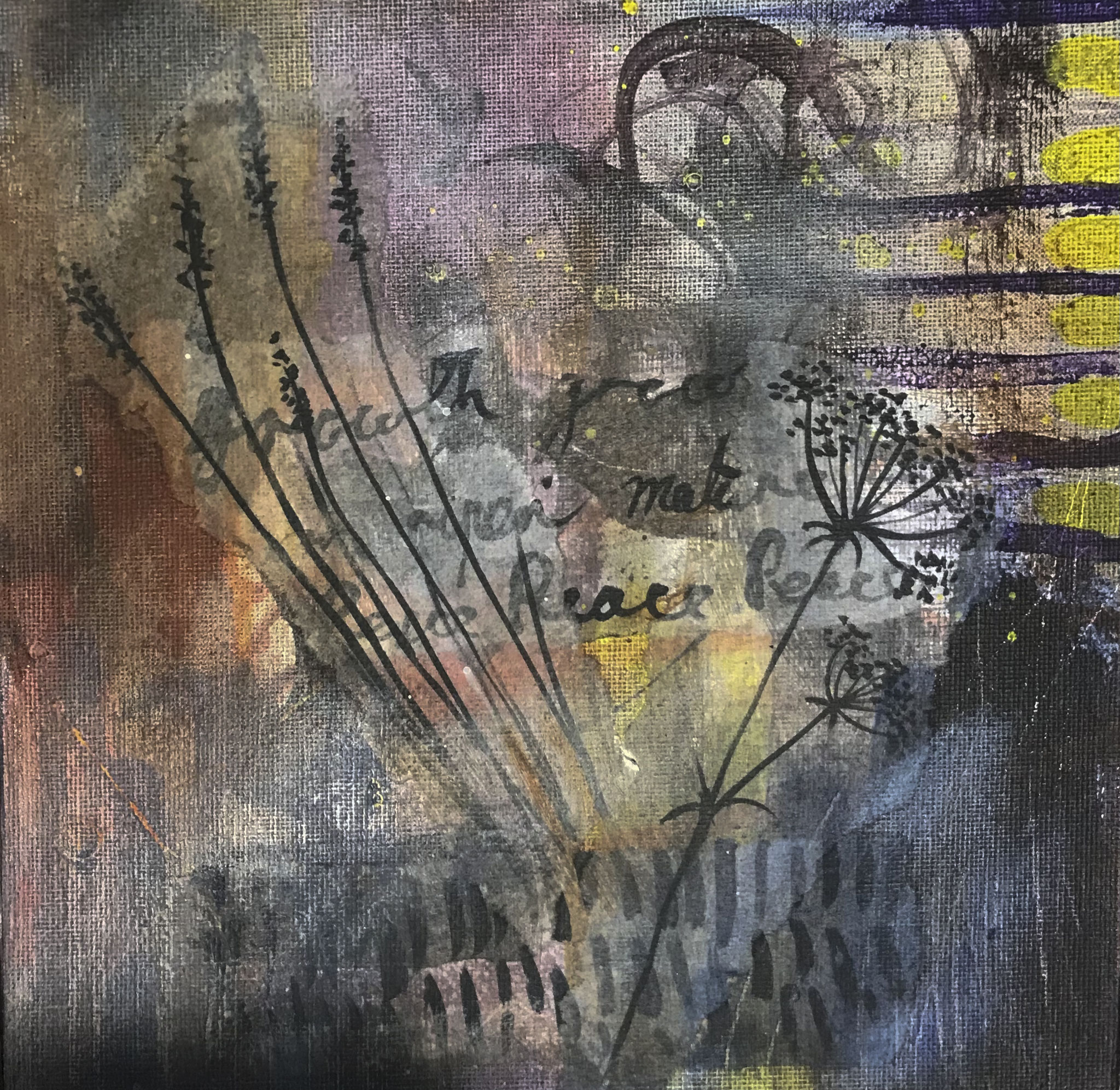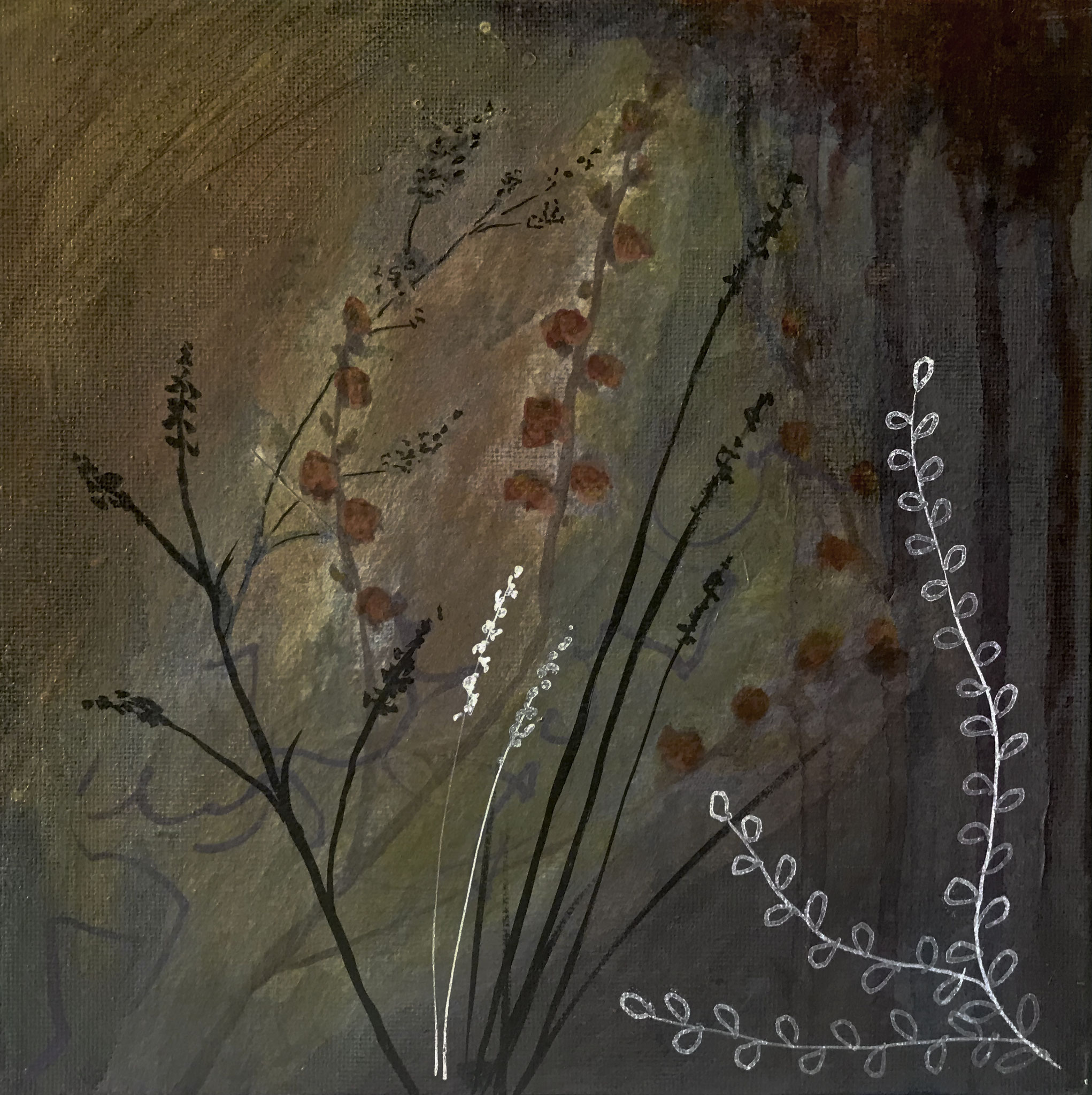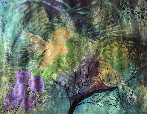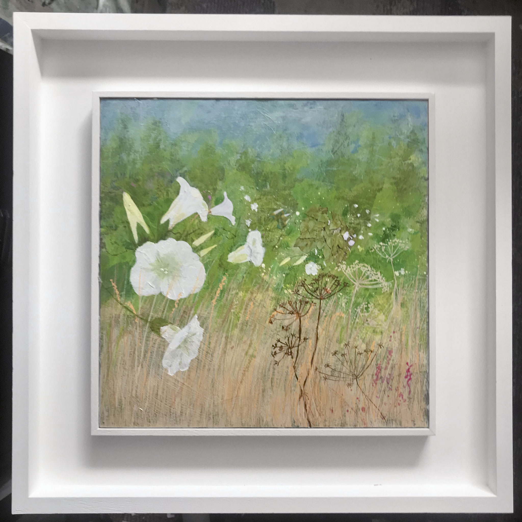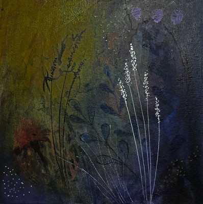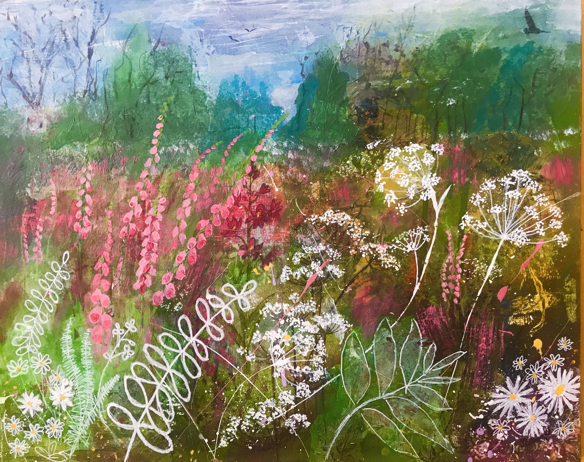 This selection of work is mixed media in acrylic, collage and print, exploring the colours of the Devon countryside. I use my own original photography and gel printed papers for many of these paintings